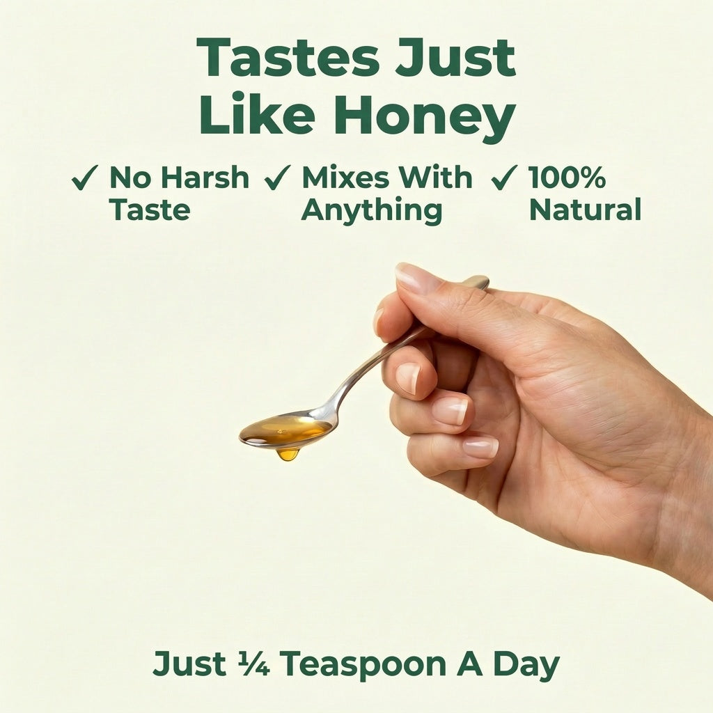 It has a mild herbal taste — nothing harsh or overwhelming. Most people mix it into water, juice or a morning drink and barely notice it. It's ¼ teaspoon so it goes down fast and easy. No pills, no powder, no bad aftertaste.